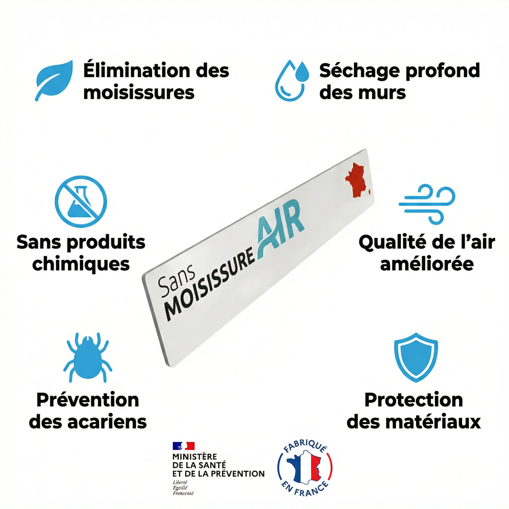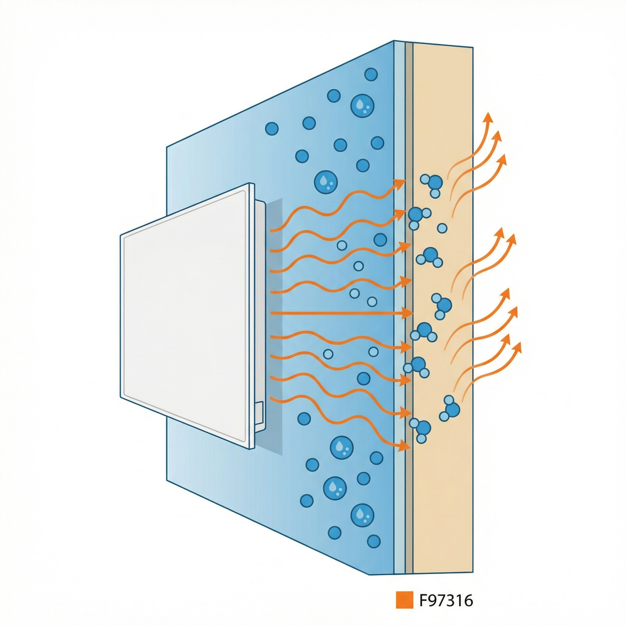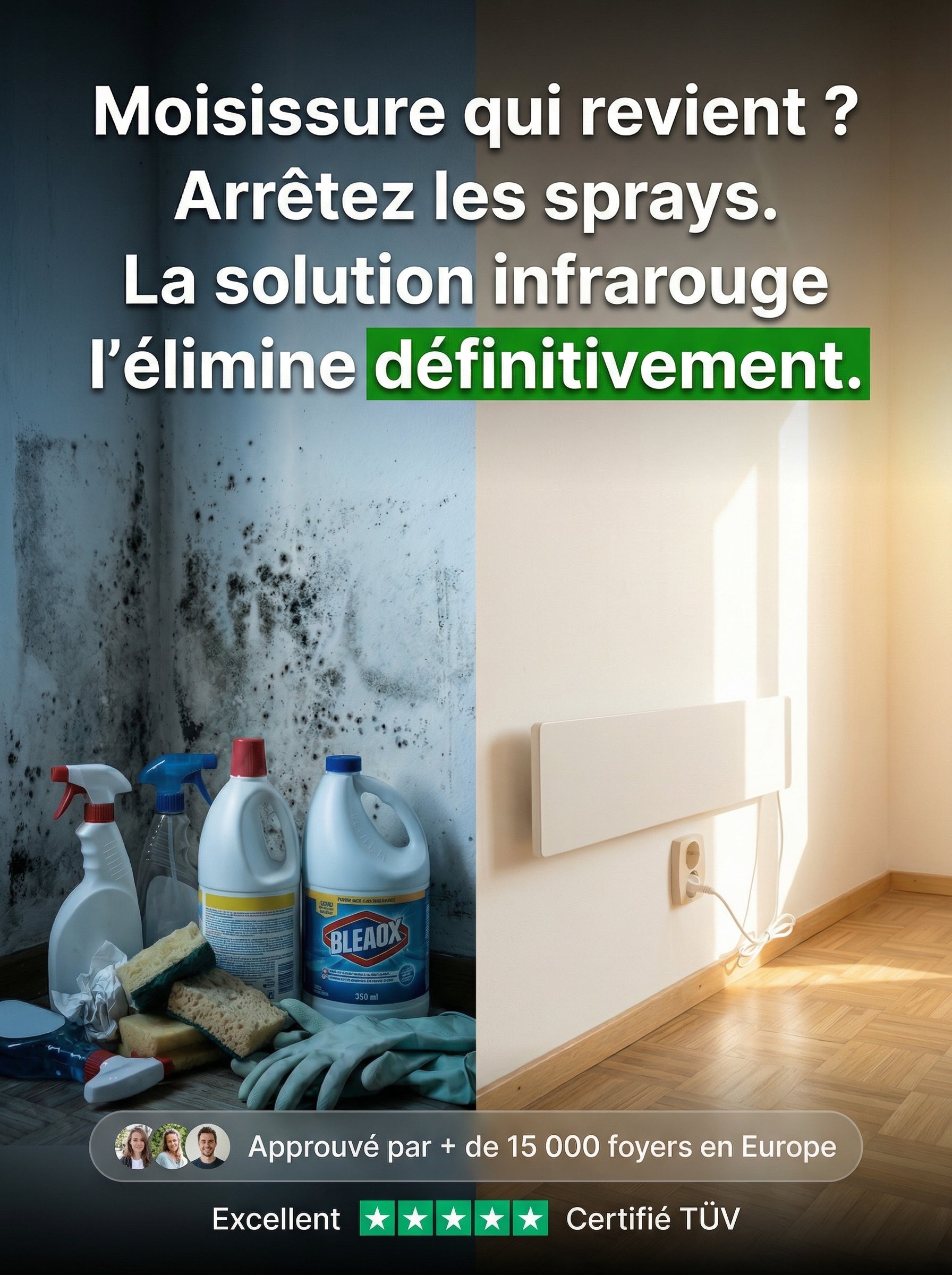 Les ondes infrarouges pénètrent jusqu'à 3 cm dans le mur. L'humidité s'évapore de l'intérieur vers l'extérieur. En 4-6 semaines, le mur est sec. Sans humidité = zéro moisissure.